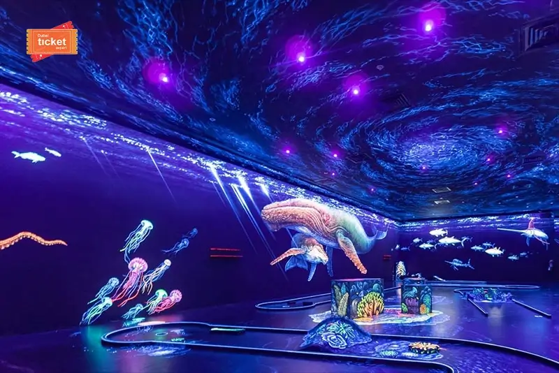 3D Blacklight Minigolf Dubai Tickets lets you play golf in an indoor blacklight setting. This one-of-a-kind 3D art zone cum golf course is at the Dubai Marina JBR, the Bahar Plaza Level. A golf session here takes you to a world of fantasy and vibrant fluorescent colors. The amazing sea creatures and thrilling space adventures art looks out of the world. Dubai Ticket Expert is offering last-minute deals on 3D Blacklight Minigolf tickets. Don’t miss the special offers and discounts!