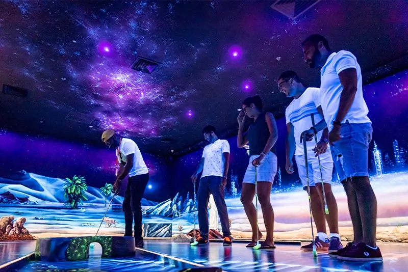 Enjoy playing golf in an immersive indoor setting at Dubai’s 3D Blacklight Mini Golf. The immersive 3D glow art on the walls, ceilings, and floors will take your experience to a whole new level.