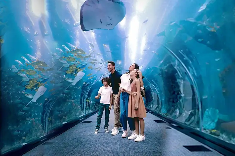 - Walk through the 48-meter underwater glass tunnel. Enjoy an awe-inspiring 270-degree view of the marine animals swimming above your head.