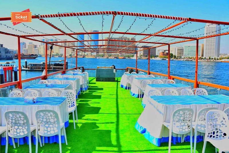 A dhow is a special wooden boat that was initially used for pearl farming and fishing. Later, it became a cruise boat with dining, music, and fun. On the wooden dhow, you enjoy a mix of adventures and stunning river views. While onboard, you receive a refreshing drink and soak in the beautiful sights of Dubai Creek. It is a two-hour cruise that starts after sunset and covers the whole of Dubai Creek.
