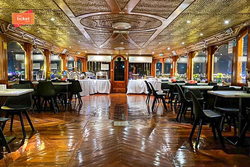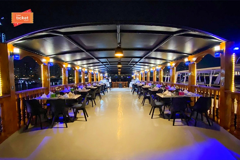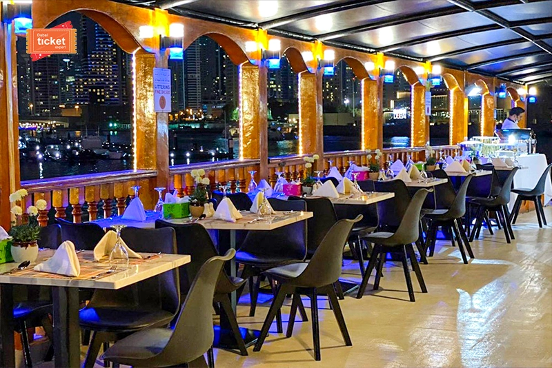 Once the cruise starts sailing, you will get complimentary welcome drinks. Settle down at the air-conditioned lower deck. Or, head straight to the open upper deck to enjoy sightseeing of the Marina coastline. Besides, don’t forget to sit for a delicious buffet dinner while enjoying the views. The elegant setting and the vintage charm will look spectacular. Also, check our dhow cruise dinner creek and luxury dinner cruise in Dubai here.