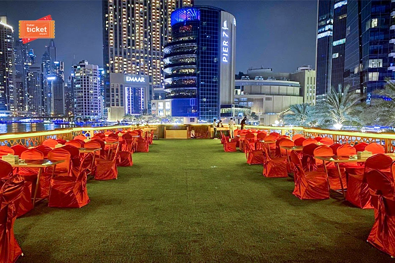 This cruise is conducted on a luxurious boat that can accommodate 500 people at a go and it covers a total area of 16000 square feet spread over 4 decks. The cruise offers a plethora of options when it comes to entertainment and food. The view of the city from the decks is spectacular and a visual treat for the eyes. The boarding time for this cruise is 8 pm and the cruise ends at 10.30 pm. The tour takes you to Palm Lagoon, JBR, Dubai Marina, and Blue Waters Islands.