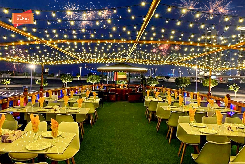 The upper deck of the Dhow Cruise is opulent and energetic, with lateral mounting structures framing the sky and the canal for water. The gleaming waterside apartments in JBR are visible, allowing you to live the illusion of the luxurious lifestyle that Dubai is known for. The ambiance is perfect for a memorable New Year’s Eve celebration.