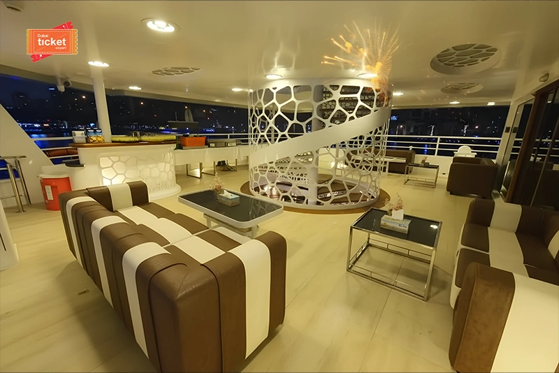 When the clock nears twelve, the excitement builds. From the decks, you’ll have the perfect view of Dubai’s famous fireworks lighting up the sky over Atlantis, JBR, and Burj Al Arab. It’s a moment you’ll want to remember forever.