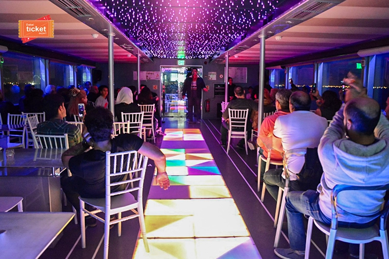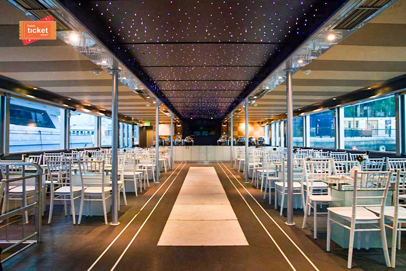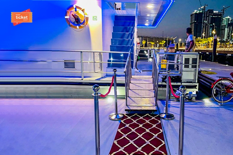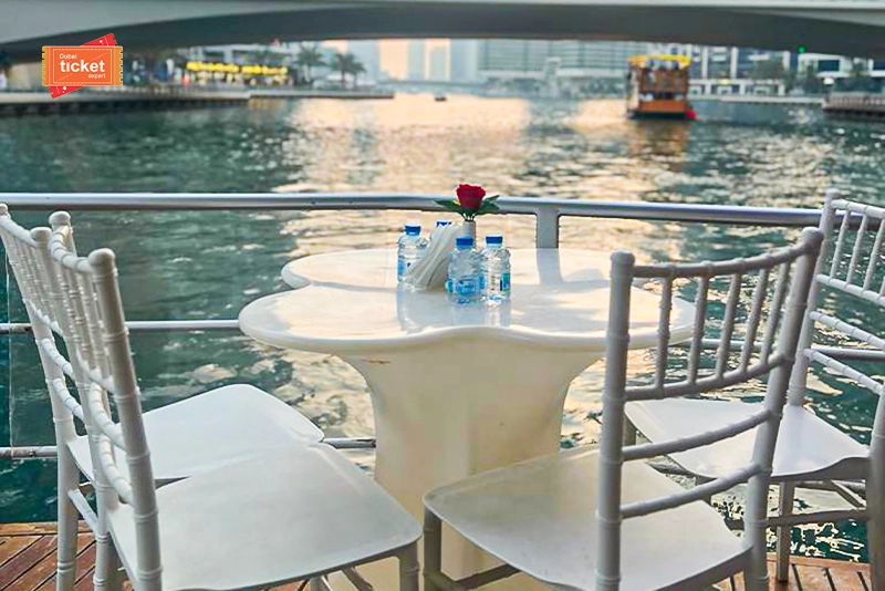 Furthermore, take advantage of the lower deck to relax in an air-conditioned setting. But, the best viewpoint is the open upper deck. Feel the soothing sea breeze to calm your senses. Also, the mesmerizing views of the Dubai coastline from here are awe-inspiring.