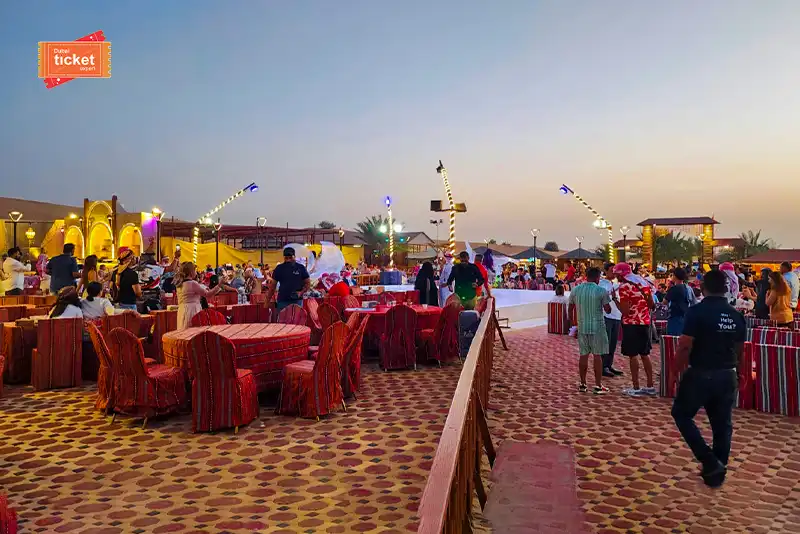 As dusk comes upon, indulge in live performances like belly dancing and Tanoura dance performances. End the experience by savoring a delicious dinner menu like shawarma, salads, Middle Eastern sweets, and BBQ dishes.